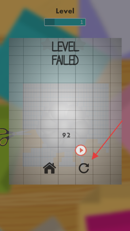 3、若显示【LEVEL FAILED】,点击下方刷新图标重新挑战关卡,调整剪纸操作,争取过关;也可点击房子图标返回主界面。