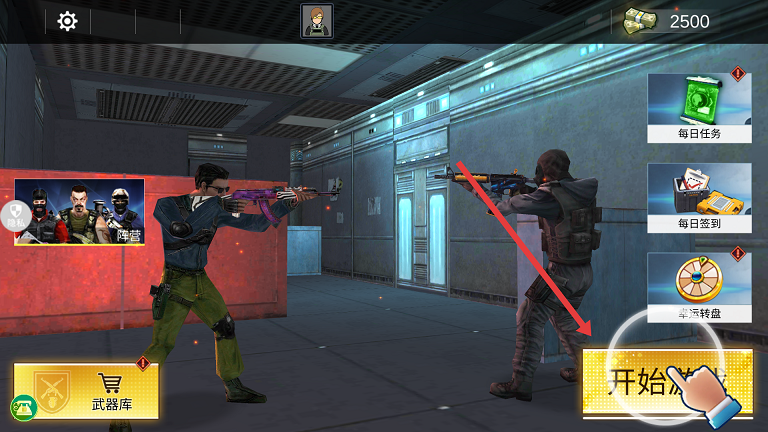 1、点击开始游戏,左手摇杆控制移动右手滑动瞄准,放完枪赶紧跑。