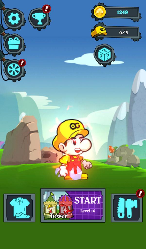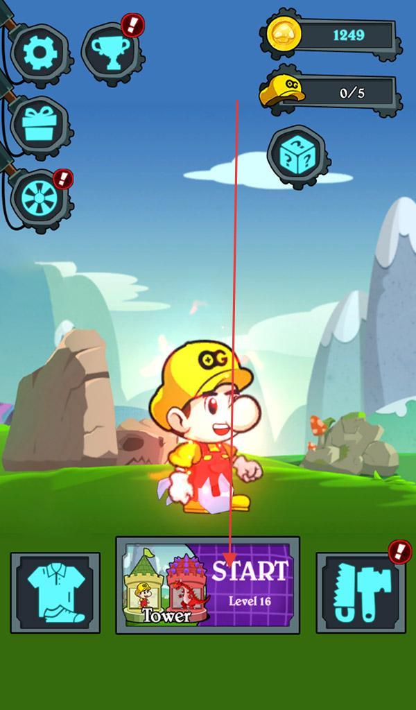 1、玩家操控戴黄帽子的角色,界面显示金币数量(如1249)等资源信息,点击“START”进入关卡。