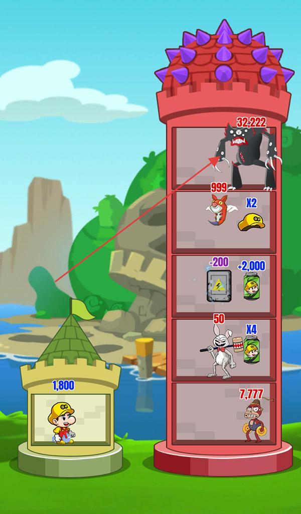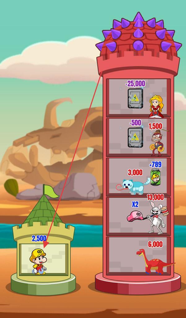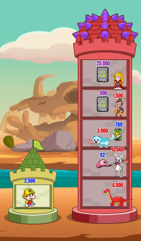 2、关卡内有高低不同的城堡,玩家需让角色从低城堡向高城堡进发,每层高城堡有不同的奖励。