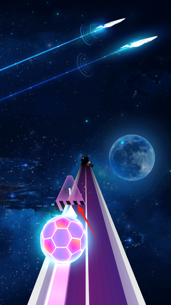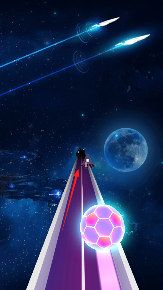 1、操控发光球在太空轨道前进,依红色箭头指引,及时改变路径躲避标有数字的方块等障碍物。