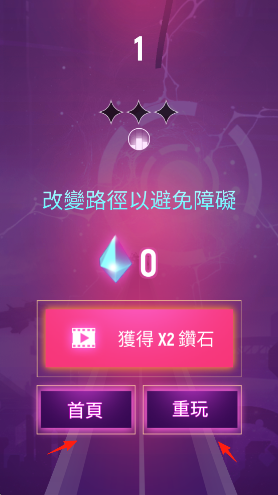 3、游戏结束界面,可按需选择点击“首頁”返回首页,或点击“重玩”再次挑战当前关卡。