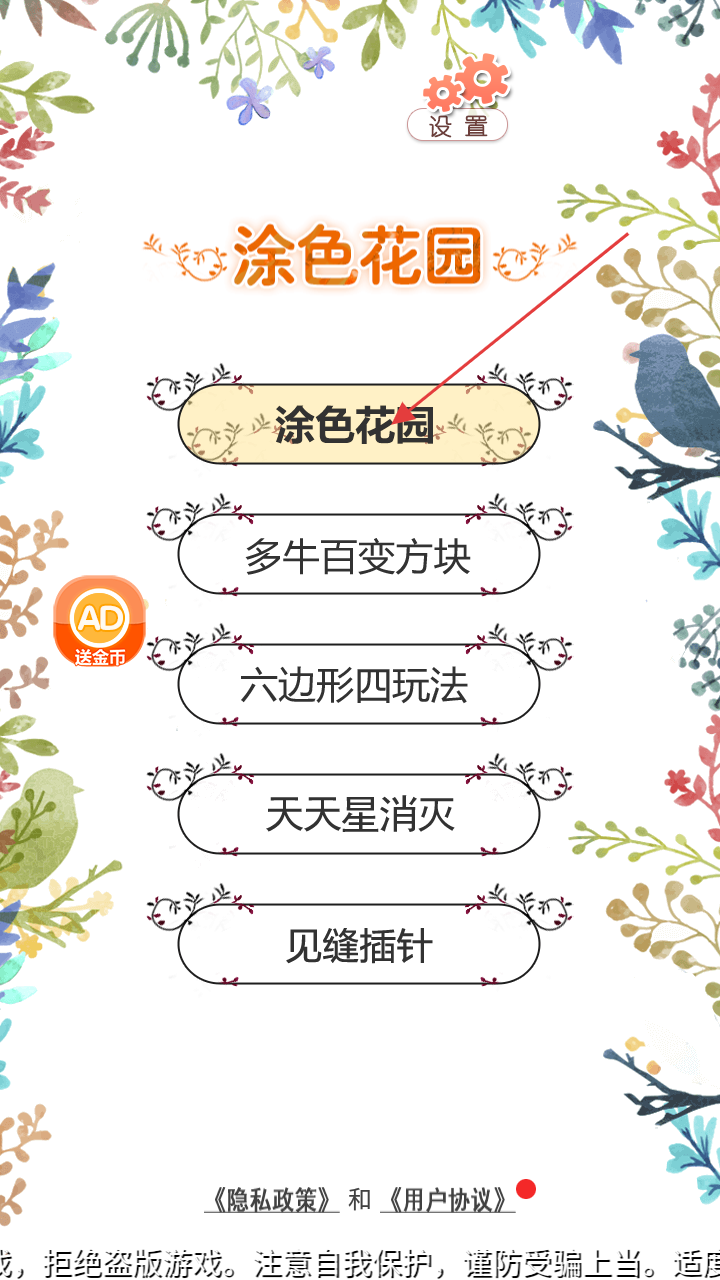 1、在游戏主界面选择“涂色花园”进入,界面提供多种分类图案(如人物、花朵、动物、建筑)。