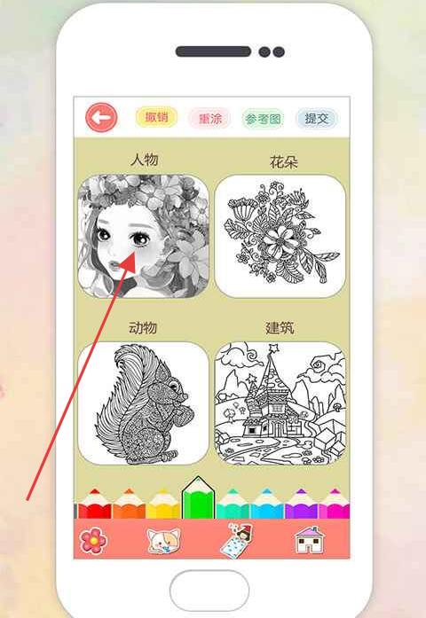 2、玩家可点击选择心仪的图案(如人物类图案),下方有彩色笔工具条,选择对应颜色进行涂色。