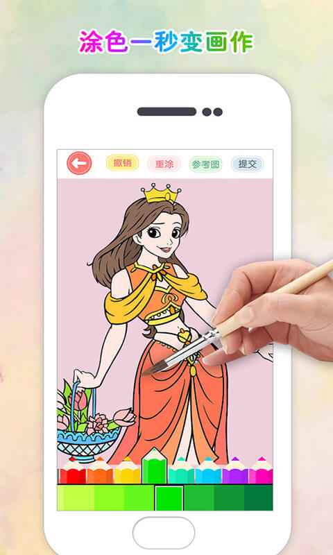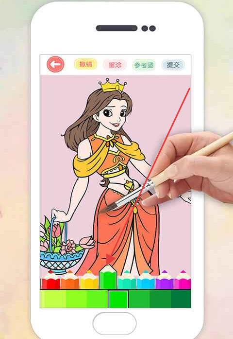 3、涂色过程中可使用“撤销”“重涂”“参考图”功能辅助,完成涂色后点击“提交”,可保存作品或分享,享受创意涂色乐趣。