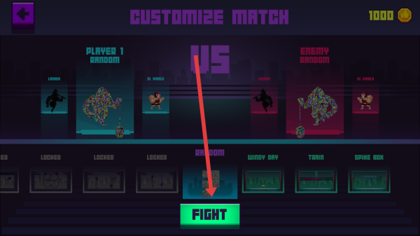 2、进入“CUSTOMIZE-MATCH”界面,确认角色和敌人配置后,按箭头指示点击“FIGHT”按钮,开始对战。
