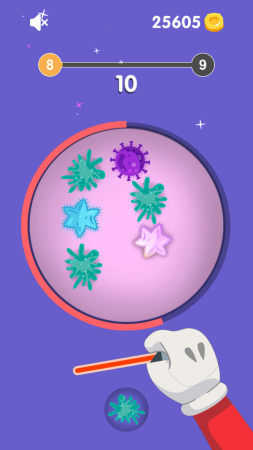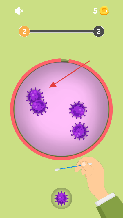 3、用棉签操作,按箭头指向处理紫色病毒,完成关卡任务,注意关卡进度,积累分数与金币。