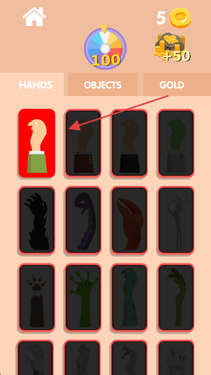 2、进入道具界面,【HANDS】分类下选择不同手部道具,消耗金币解锁,提升游戏能力。