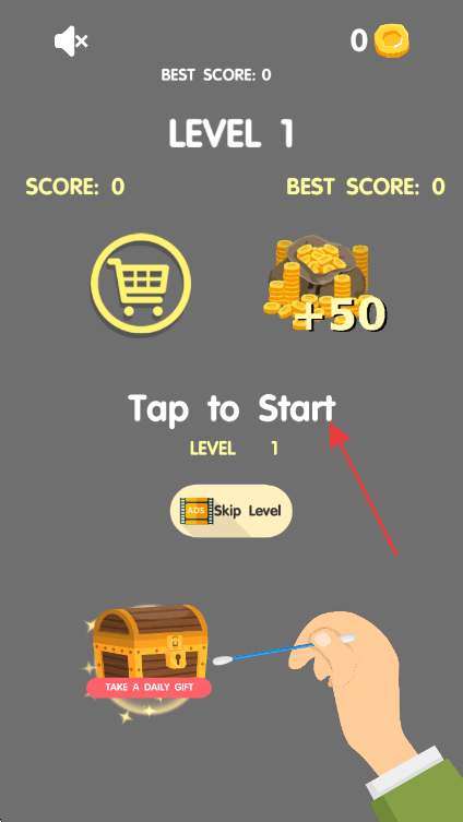 1、在游戏主界面,点击【Tap to Start】开启【Level 1】,可查看得分、最佳得分等数据,还能通过购物车或宝箱获取奖励。