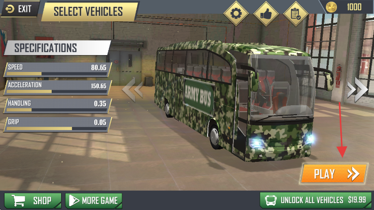 1、在车辆选择界面,查看军绿色巴士的速度、加速度等参数,点击橙色【PLAY】按钮开始游戏。