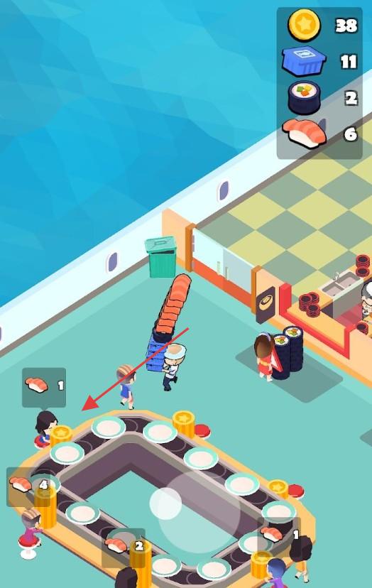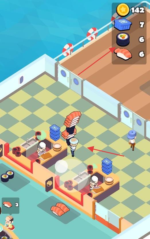 1、玩家操控角色在寿司店及船上场景中,收集金币、寿司、箱子等资源,增加资源储备。