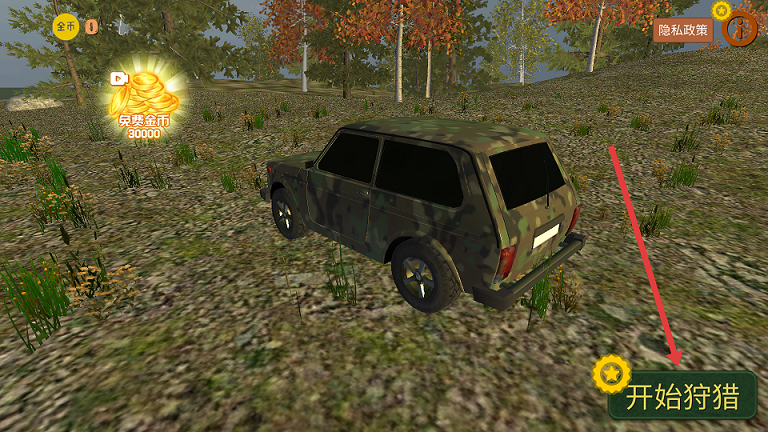 1、点击开始狩猎,扛着祖传猎枪开车摸黑进森林开始探险。