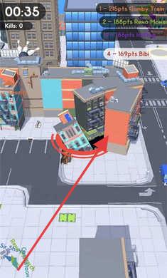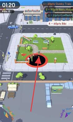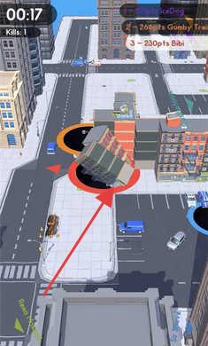 2、操控游戏内类似黑洞的装置,按红色箭头指示方向移动,吞噬如建筑、行人等场景内物体。