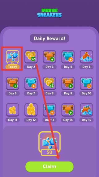 1、打开进入【Merge-Sneakers】,在每日奖励界面,按箭头指示,点击“Claim”按钮领取当日奖励。