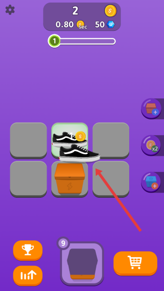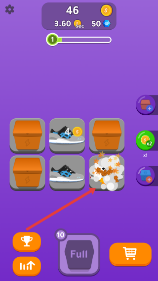 2、进入游玩主界面,按箭头指向,点击箱子获取运动鞋,将相同的运动鞋或相关物品进行合并,获取更高等级物品。