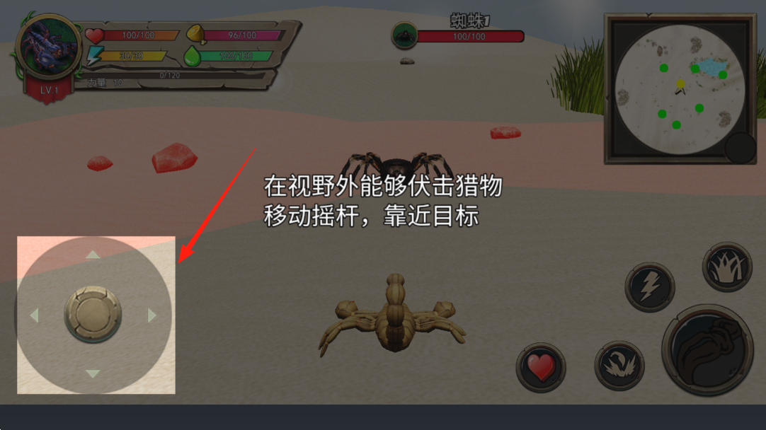 1、明确狩猎目标为“蜘蛛1”,其生命值为百分之百,玩家角色各项状态指标也在界面上方显示,可随时关注自身状态。