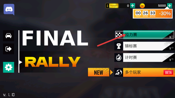 1、在游戏模式选择界面,留意到【拉力赛】选项被箭头指向,点击它选定比赛模式。
