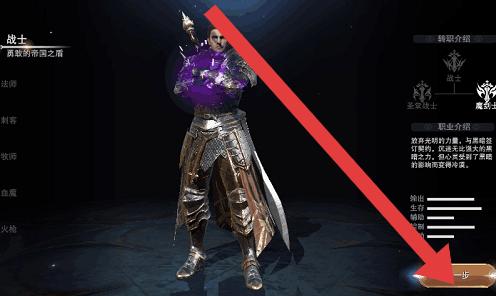 2、在职业界面(如战士等),选好职业(图示战士职业)后,点击【下一步】按钮,确认职业选择。