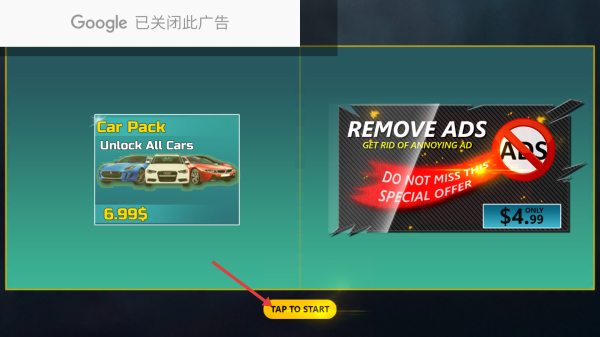 1、在广告界面,点击【TAPTOSTART】按钮,跳过广告进入游戏。
