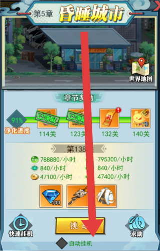 2、进入昏睡城市第5章,关注章节进度与净化进度,点击【挑战】按钮,能推进关卡,获取丰厚资源。