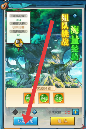 3、参与组队挑战玩法时,点击【快速匹配】按钮,可快速找到队友,共同挑战副本,获取海量经验等奖励。