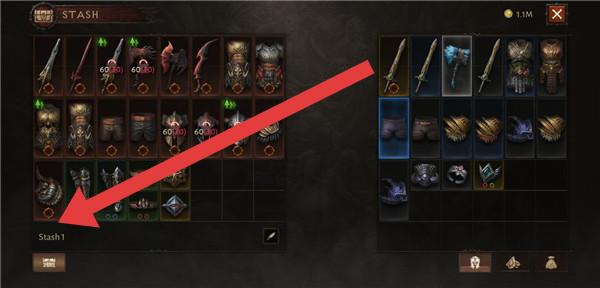 2、打开仓库界面(Stash),合理整理与存放装备道具,标记为“Stash1”的区域可用于分类存储,方便后续取用。
