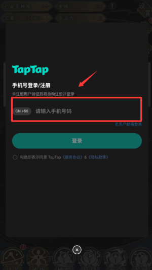1、打开游戏后,点击输入你的手机号码注册。