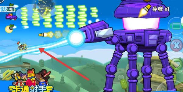 3、新场景中,留意紫色大型机器人敌人及【导弹x1】道具,灵活操控角色,适时使用武器射击,保持战斗优势。