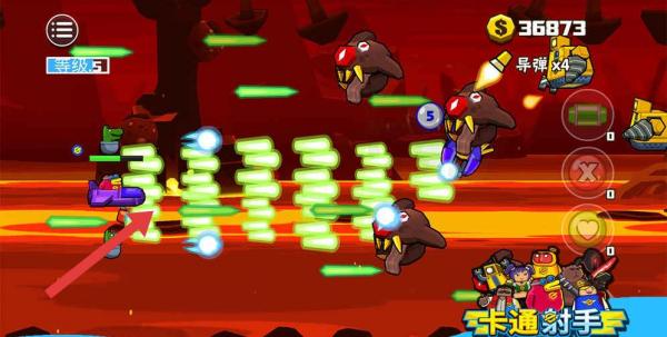 2、关注屏幕显示的【$36873】金币数和【等级5】,使用【导弹x4】等道具消灭怪物,获取金币并提升等级。