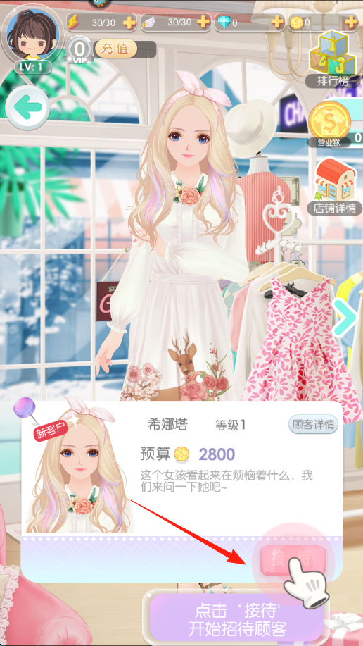 1、在游戏中看到新客户希娜塔,其预算为2800,点击“接待”按钮,开启服务流程。