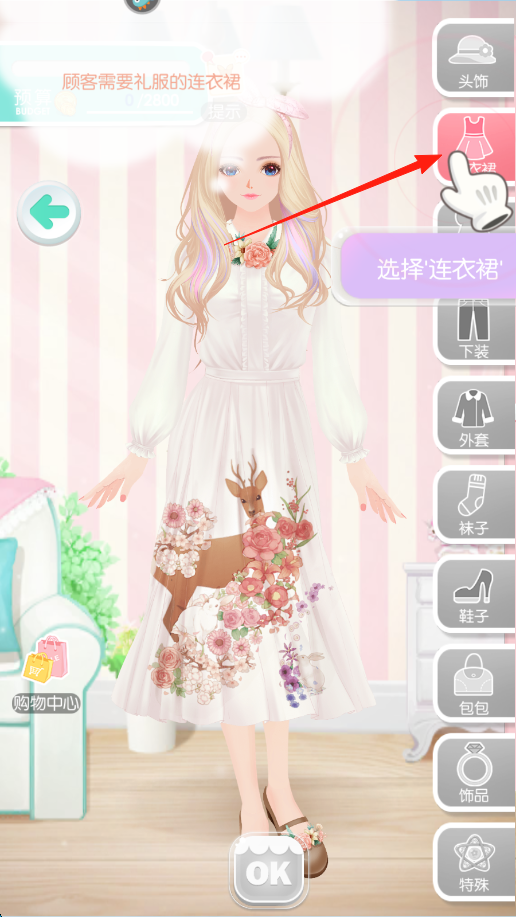 2、依据提示“顾客需要礼服的连衣裙”,点击“连衣裙”选项,从服装库中挑选出符合礼服风格的连衣裙搭配。