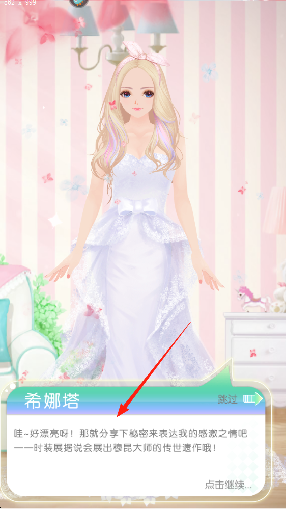 3、完成搭配后,希娜塔表达满意并分享时装展信息,点击“点击继续”,推进游戏剧情,解锁后续内容。