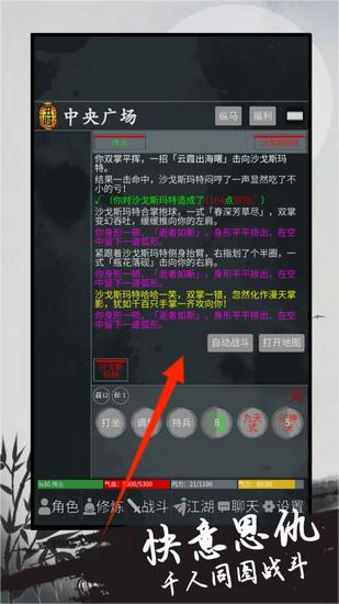 3、玩家可点击“自动战斗”让角色自动出招,或点击“打开地图”查看战斗场景,利用“打坐”“调息”等功能调整角色状态,参与多人混战,快意恩仇。