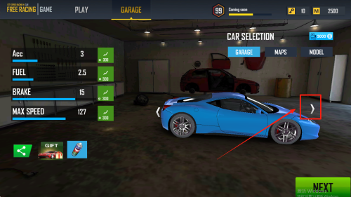 2、在车库界面浏览多款性能各异的赛车,根据赛道特点选择最适合的座驾。