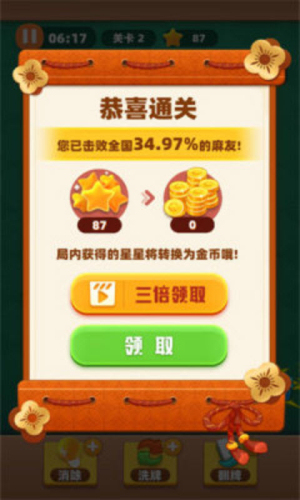 4、在游戏过程中,注意观察麻将的排列,合理安排消除顺序,能有效提高消除效率。思考策略,寻找最佳路径是成功的关键。