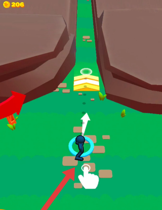2、按箭头方向和手指提示,操控角色在道路上跳跃前进,躲避障碍并收集金币。