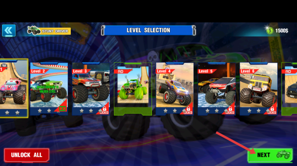 2、在关卡选择界面,按箭头指示点击【NEXT】按钮,浏览更多关卡选项。