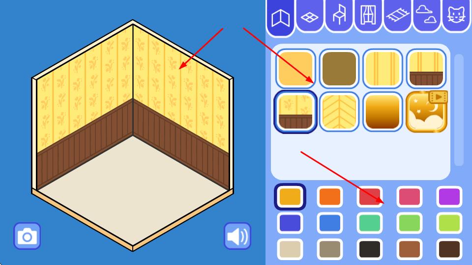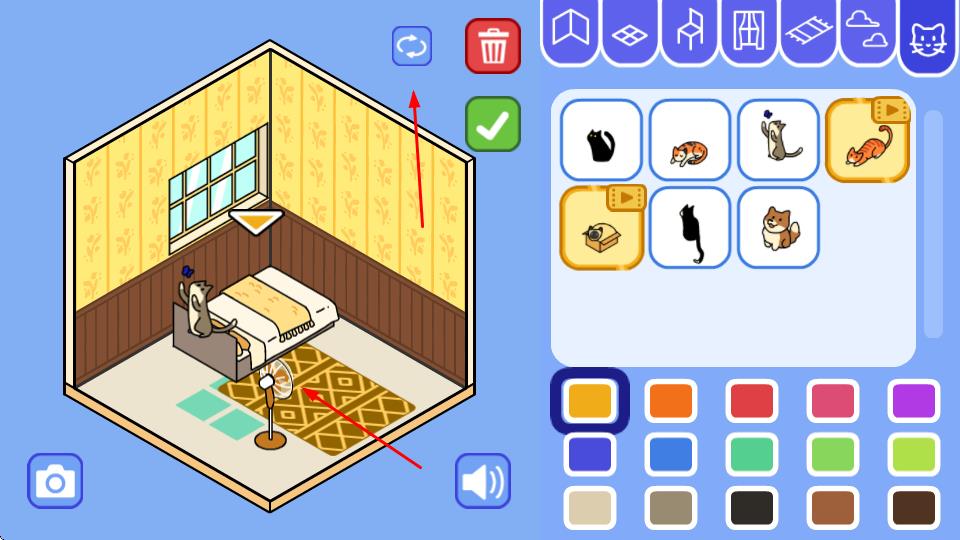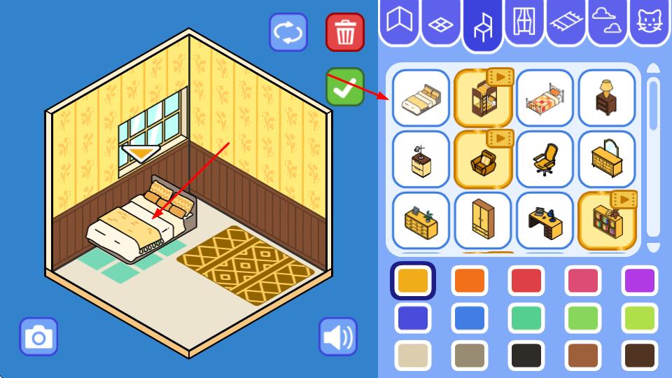 1、玩家可在右侧装饰栏选择不同元素,如墙纸、颜色、家具、宠物等,对房间进行个性化装饰。
