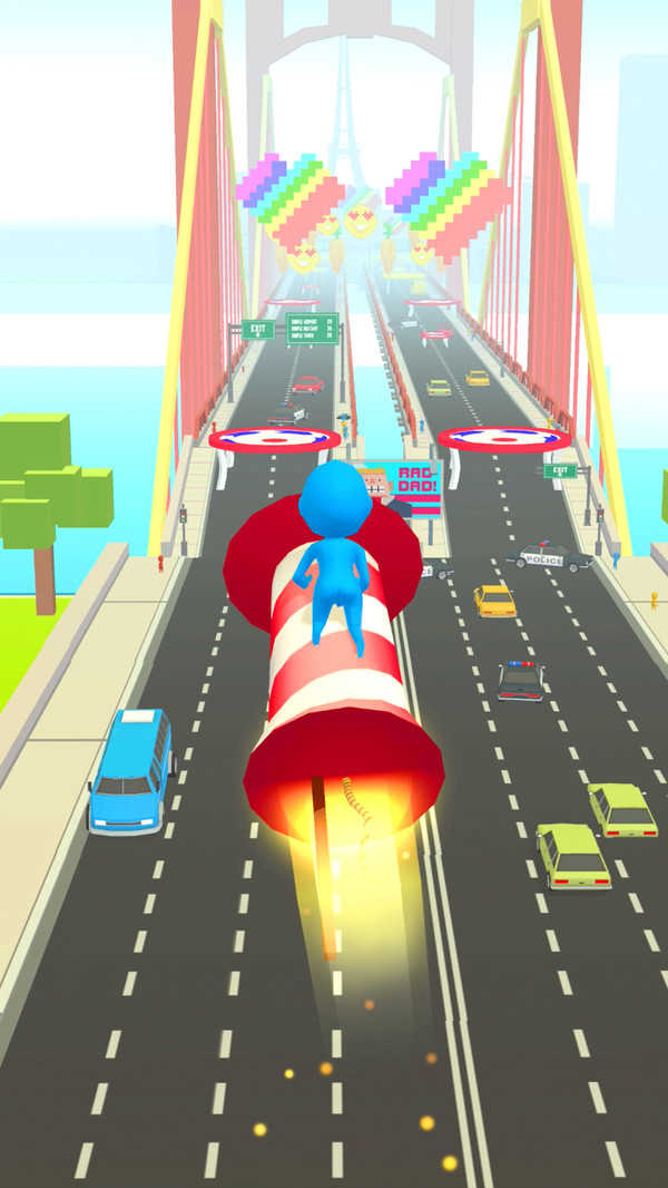 极限飞跃窜天猴是一款色彩缤纷的搞笑休闲跑酷游戏,玩家选择不同颜色的橡皮人角色,操控其搭乘炮弹或飞行器在奇幻赛道上穿梭,利用“窜天猴爆炸飞天”“螺旋炮冲刺”等专属技能规避障碍,收集金币与道具,在低模卡通场景中体验魔性飞行的解压乐趣。