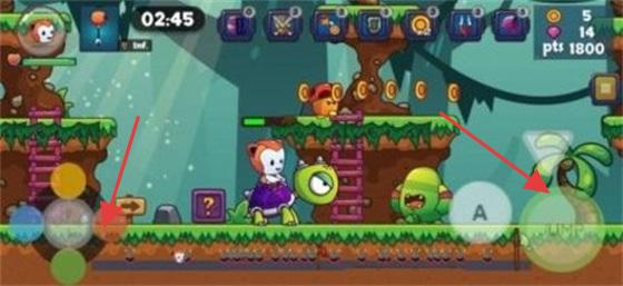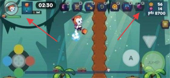 1、玩家通过屏幕下方的方向键和“JUMP”“A”等按钮,操控游戏角色移动、跳跃,在丛林场景中穿梭。