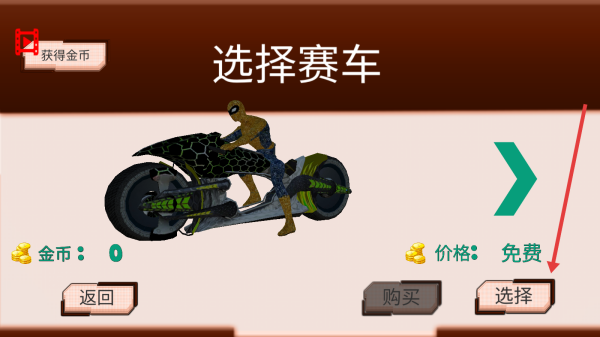 2、在赛车选择界面,确认赛车免费后,点击【选择】按钮,选定当前赛车。
