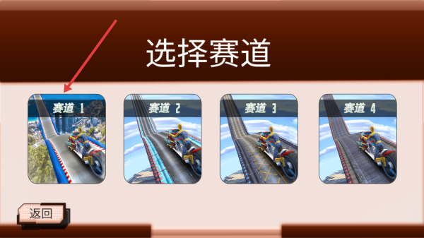 3、在赛道选择界面,按箭头指示点击【赛道1】选项,进入该赛道开始游戏。