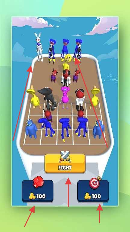 1、在对战场景中,玩家可点击“FIGHT”按钮发起战斗,还能花费金币选择拳击手套等道具提升战斗能力。
