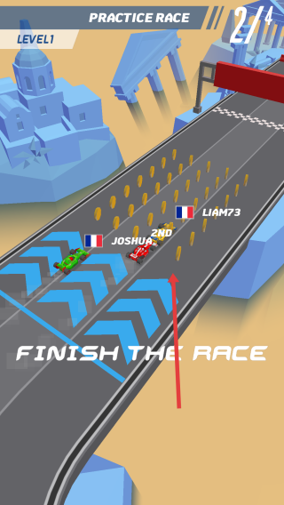 3、继续依照箭头指引,收集赛道上的金币,努力率先冲过终点线,完成比赛目标。