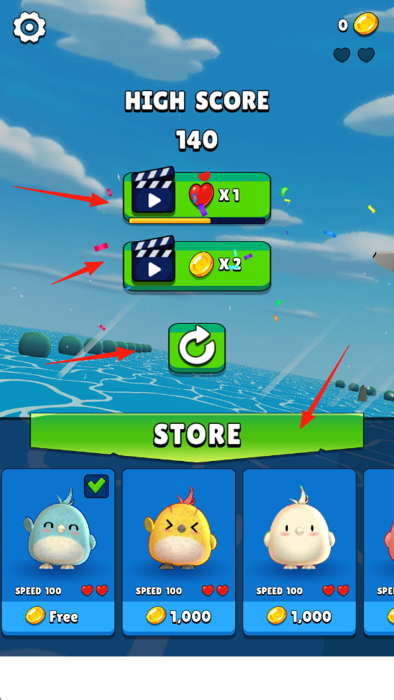 3、游戏结束后,可点击带有【播放】标识的按钮获取奖励,如生命或金币;也可点击【STORE】进入商店,使用金币解锁新角色。