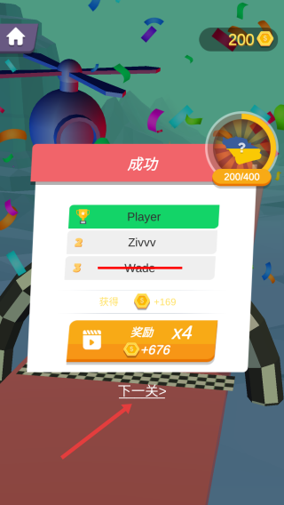 3、成功完成比赛后,看到【成功】提示,点击【下一关>】按钮,进入下一关卡。