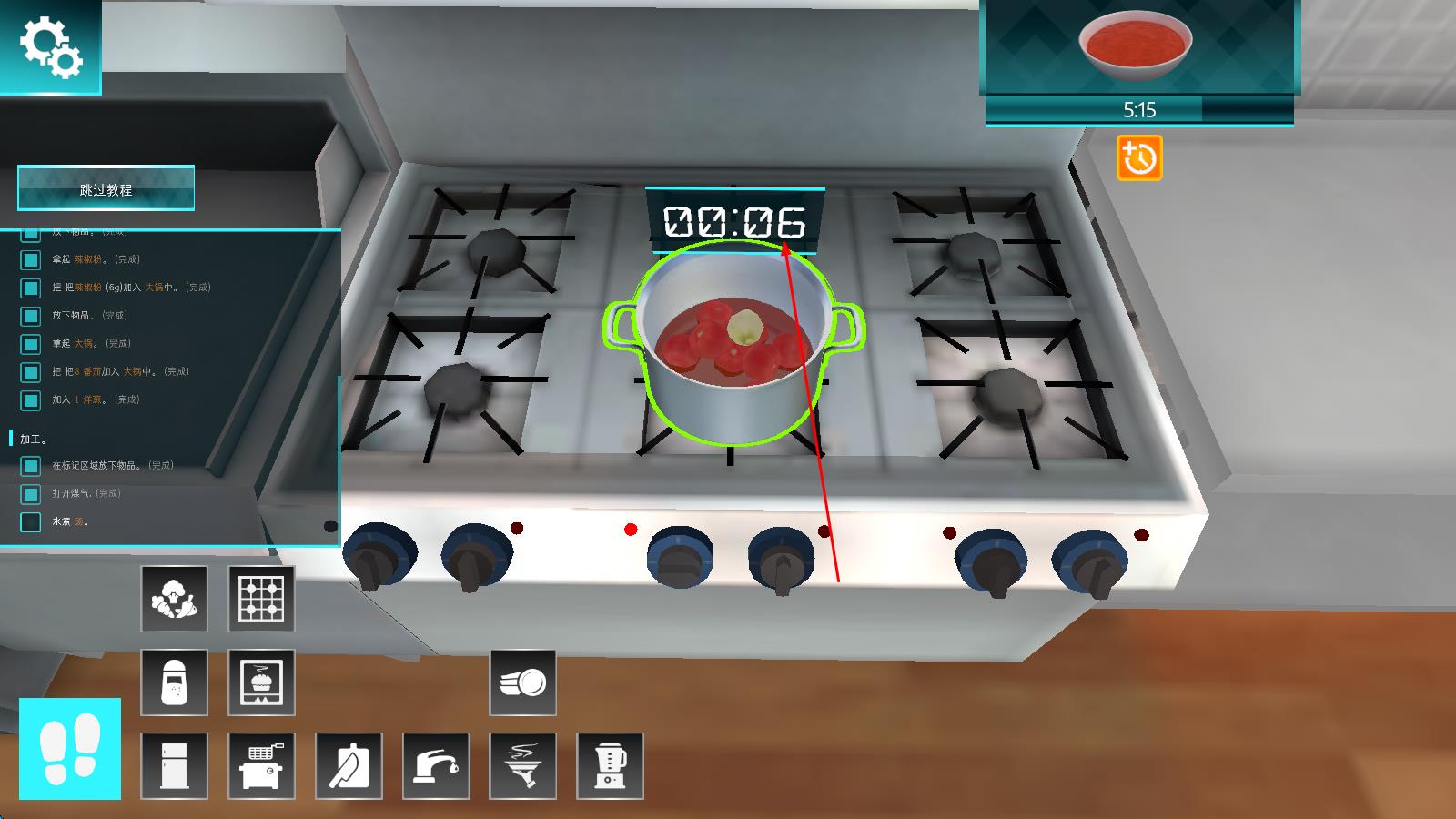 2、烹饪途中,玩家需熟悉各类厨具操作,从简单菜式练手,逐步尝试复杂组合,在逼真重力反馈中提升颠勺、调味等技巧。