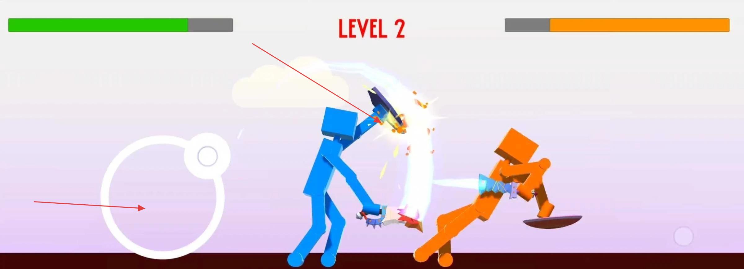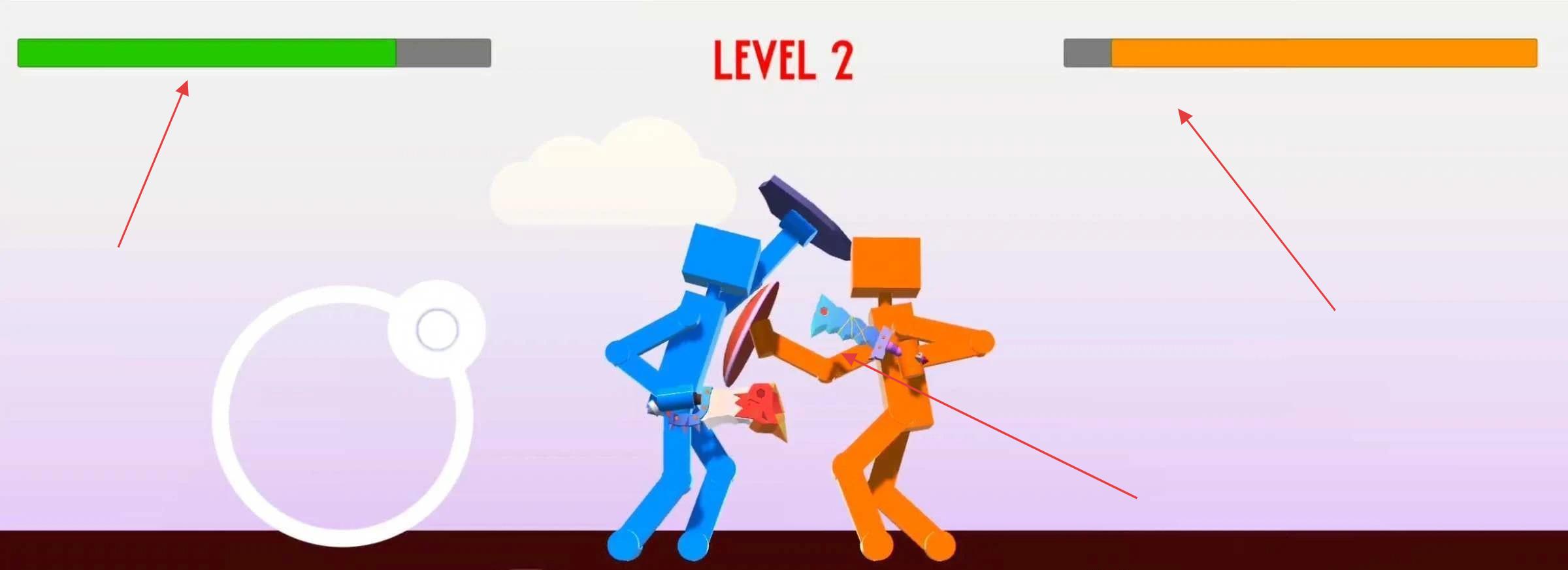1、玩家操控蓝色方块人,与橙色、黄色等不同颜色的方块人进行一对一战斗,利用手中武器攻击对手。