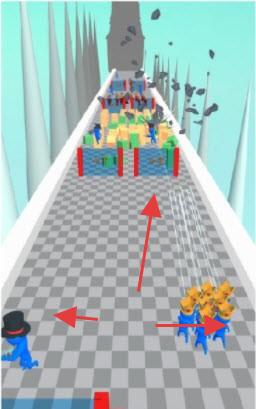 1、玩家操控蓝色小人队伍在赛道上前进,通过操作改变队伍行进方向,应对赛道上的状况。