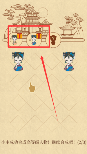 1、基础玩法,通过滑动合并相同角色提升等级,结合宫廷剧情任务完成角色培养,最终目标是将小宫女培养成皇后。